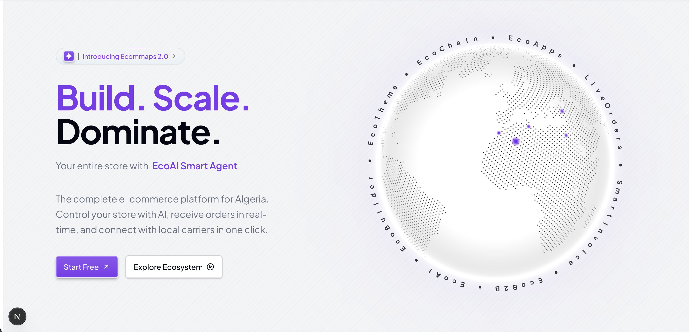 اكتشف كيف تبدأ تجارتك الإلكترونية في الجزائر بسهولة مع Ecommaps. دليل متكامل يشرح الثيمات، EcoBuilder، وتكامل شركات الشحن مثل ياليدين.